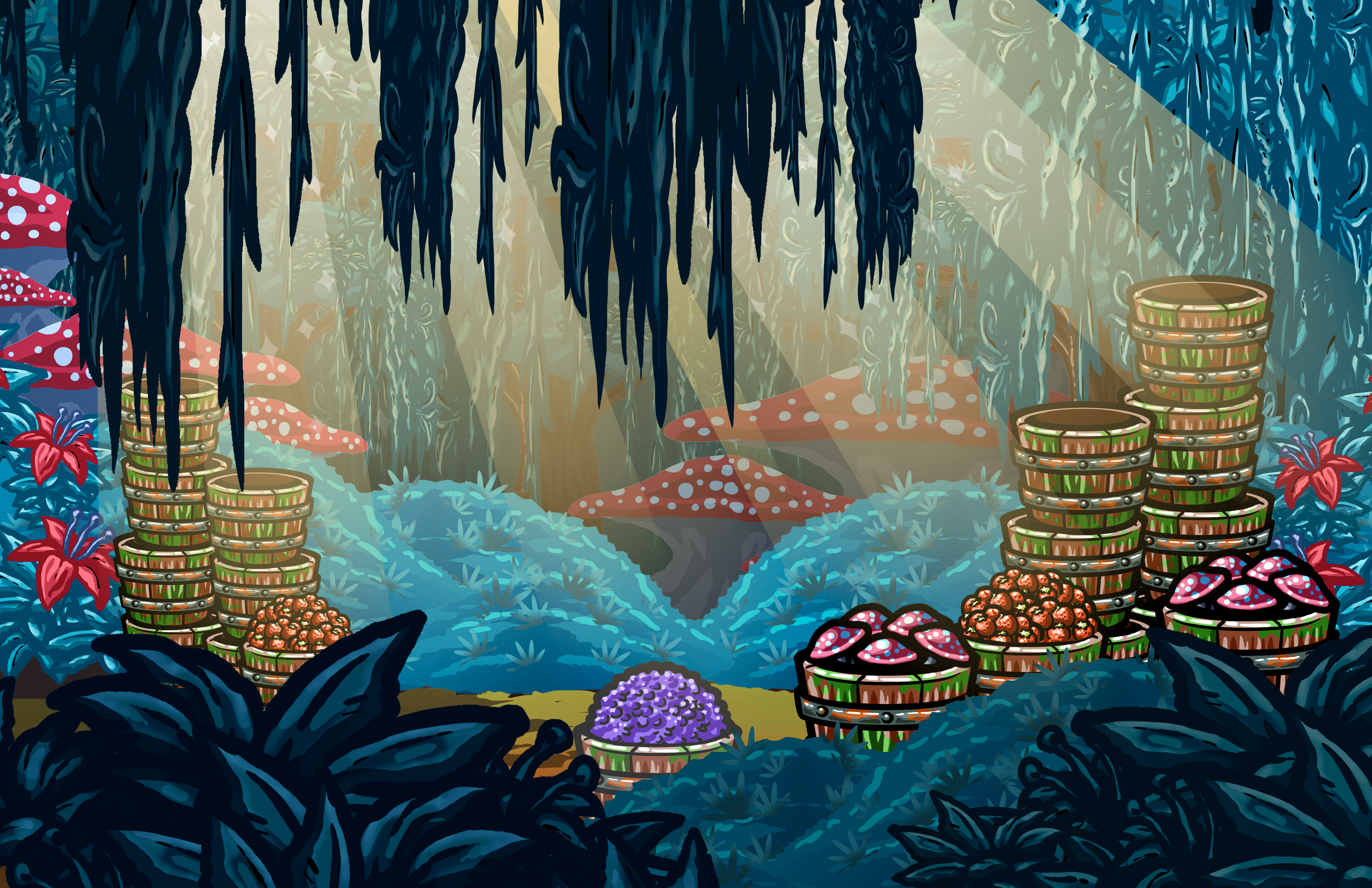 The sun rose over the clearing, and the Octopies awoke bleary-eyed to see two stacks of buckets—one was overflowing with berries, the other with what appeared to be some delicious-looking Mushrooms. The Fellowship took charge in distributing out the buckets to different groups of the militia, who promptly began to share these foods around. Some chose the strawberries, too afraid of what transformations awaited them. Others took a serving of Mushrooms without fear. They all began to devour the food they had. After days without much sustenance, the raw fruits and fungi tasted incredible.
